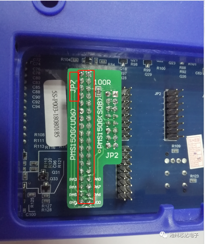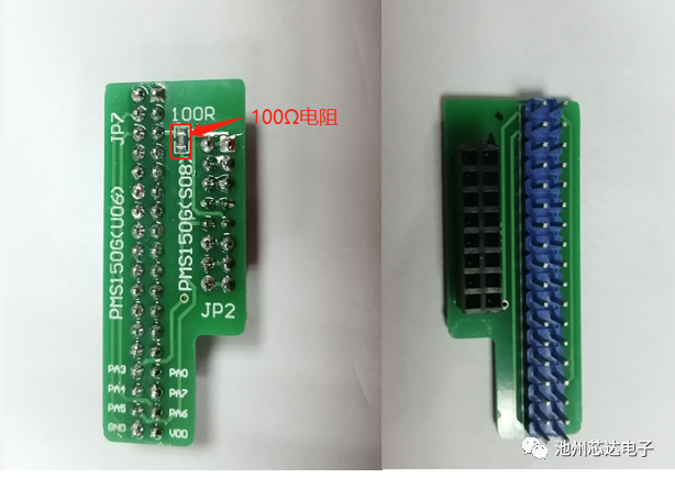 以PMS150G-S08為例,為提升IC批量燒錄的穩(wěn)定性及可靠性,燒錄前,請(qǐng)?jiān)赪riter背后JP2的PA5引腳上串一個(gè)100?的電阻。連接方式參考如下圖: