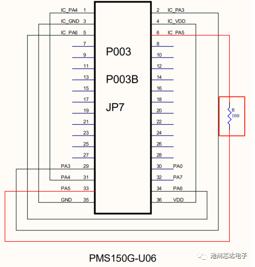 2.若燒錄U06封裝的IC,請(qǐng)?jiān)贘P7的PA5引腳處串一個(gè)100?的電阻,連接方式如下圖: